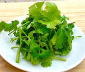 牡蠣、つぶ貝、ほたてをたっぷり使った貝ぎょうざ のパクチー入 り。