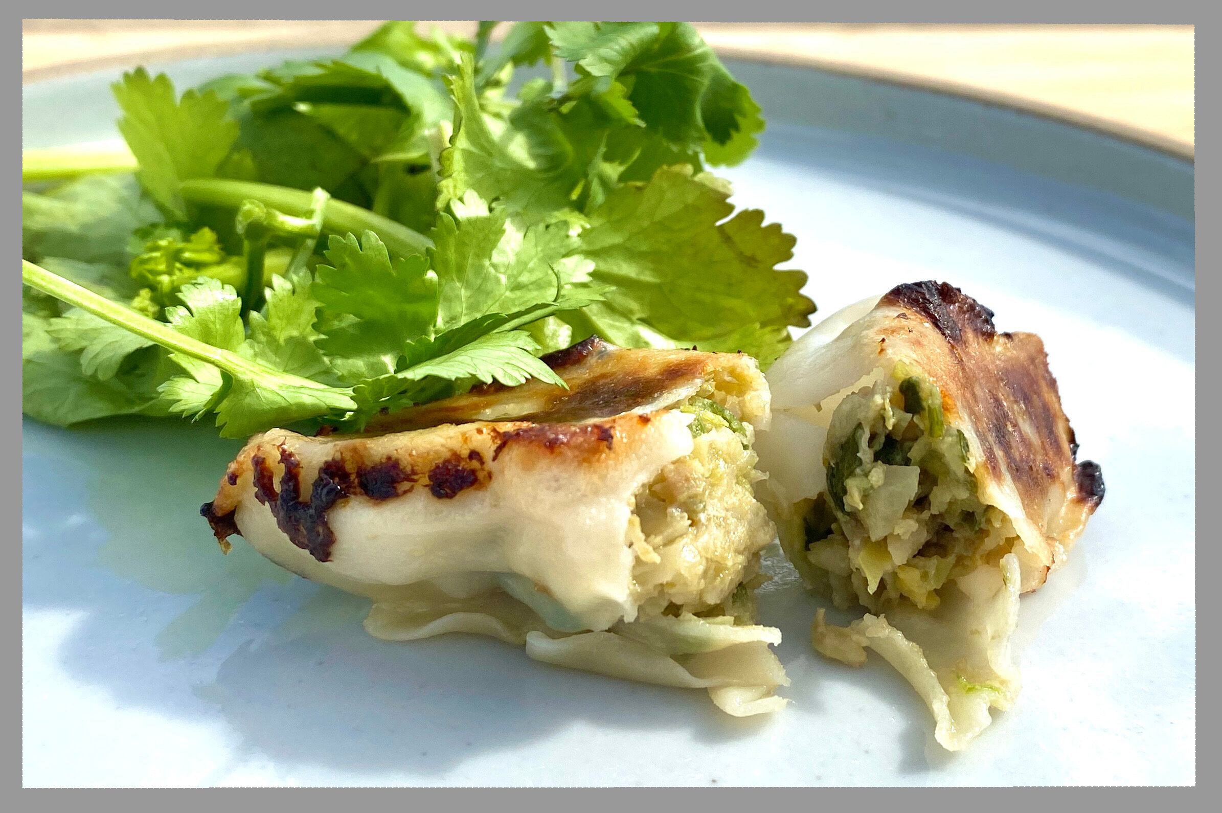 牡蠣、つぶ貝、ほたてをたっぷり使った貝汁ぎょうざのパクチー入り。